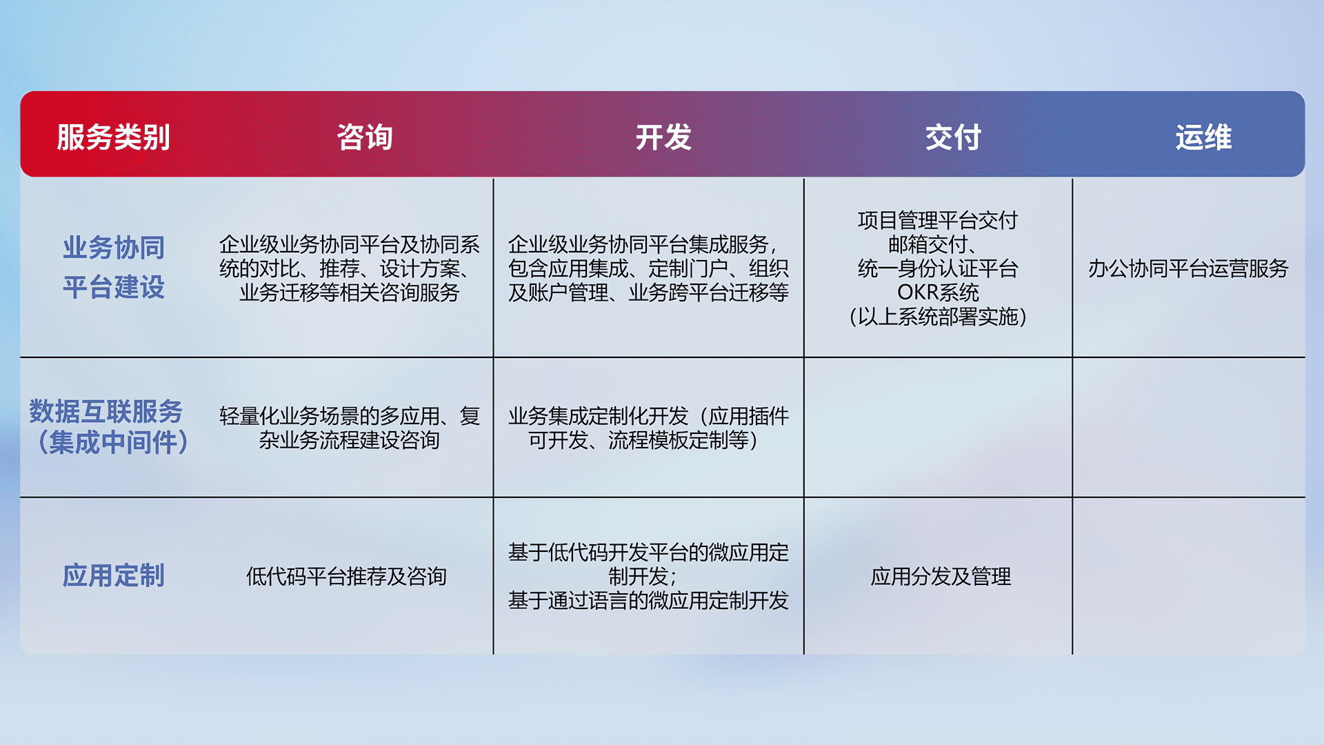 针对钉钉、、企微、、、IDaas等平台级产品提供产品的规划、、、方案、、、、交付、、、、定制化开发等服务,,实现如统一协同办公、、、、智能客户服务、、、混合会议管理、、、、智能数据查询、、、、等业务场景,,,实现数字化转型。。。