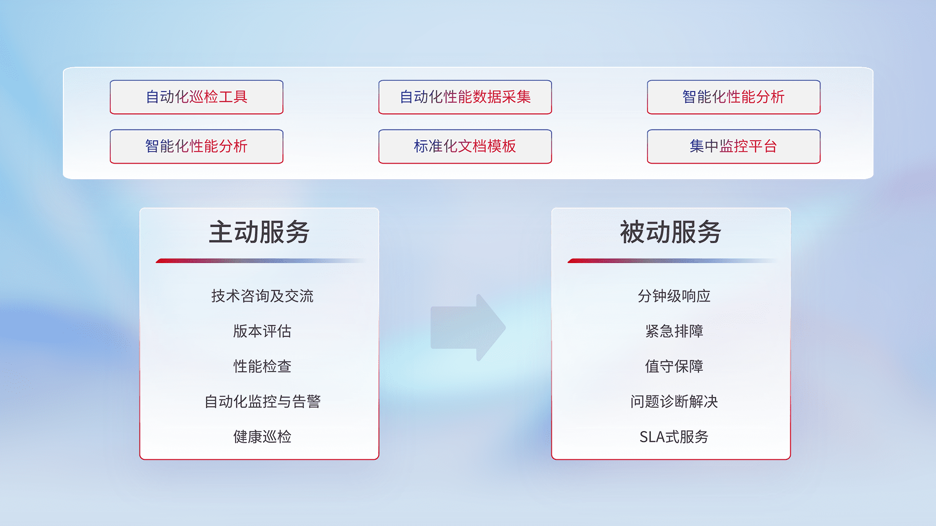 智能化工具和标准化文档,,保障服务质量,,,提供主动服务(包含技术咨询、、、版本评估、、、性能检查、、、自动化监控与告警、、、健康巡检)和被动服务包含(分钟级响应、、、紧急排障、、值守保障、、问题诊断解决、、、SLA服务)。。
